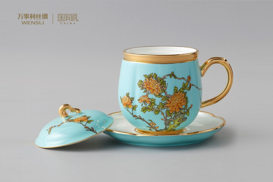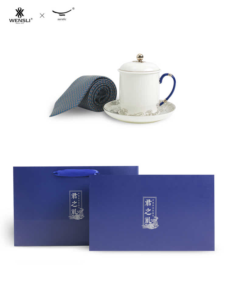 An impeccable executive gift set: This Natural Silk Tie and premium Chinese Porcelain cup combine breathable comfort with the noble elegance of pristine, gilded Eastern art.