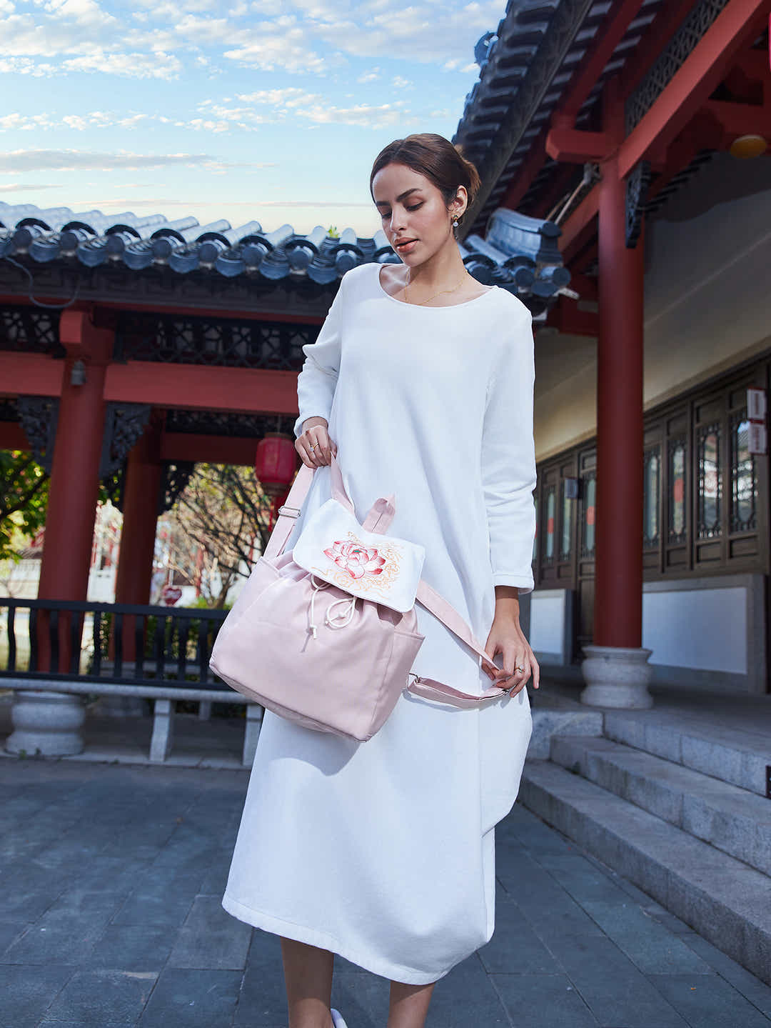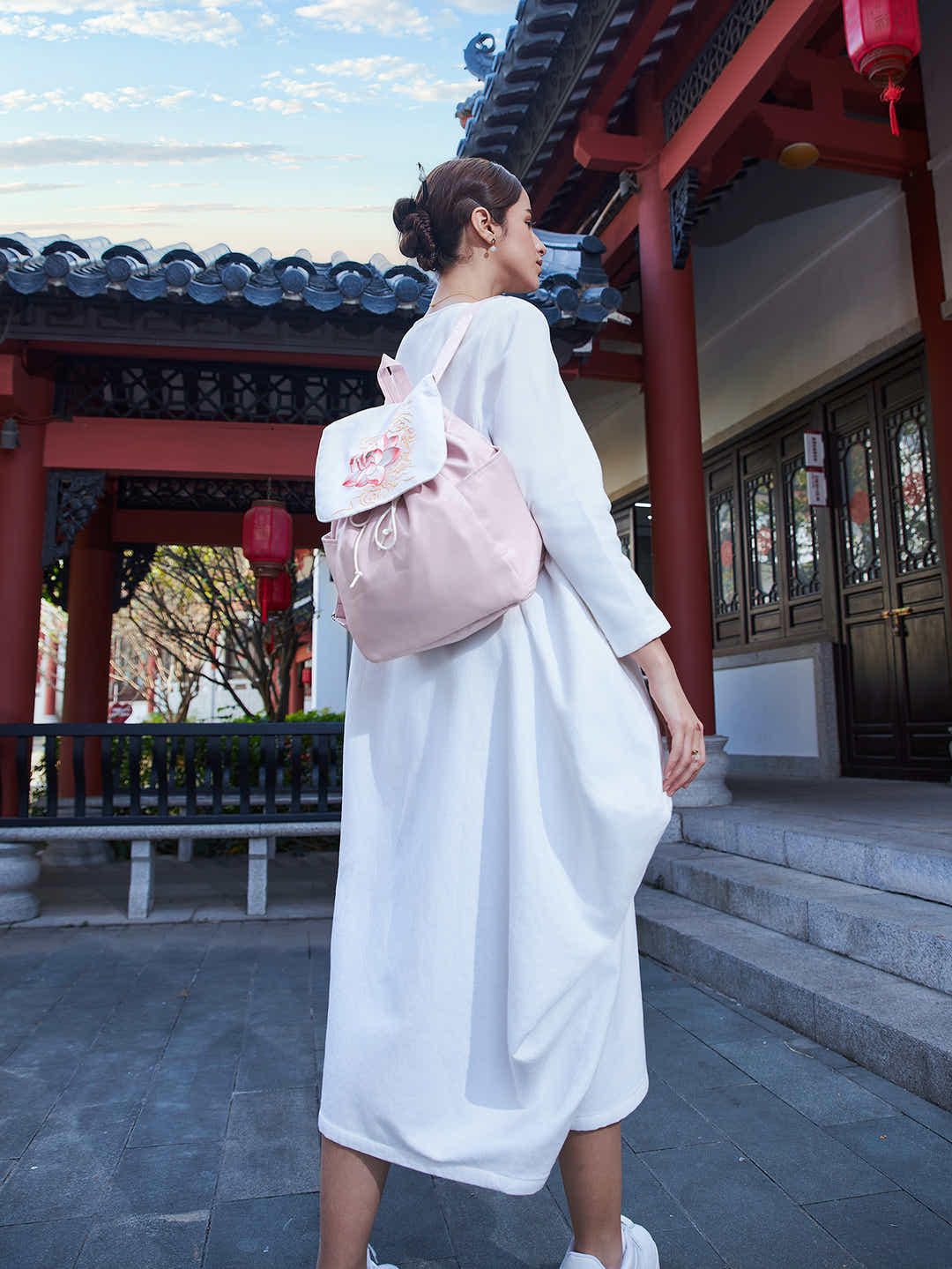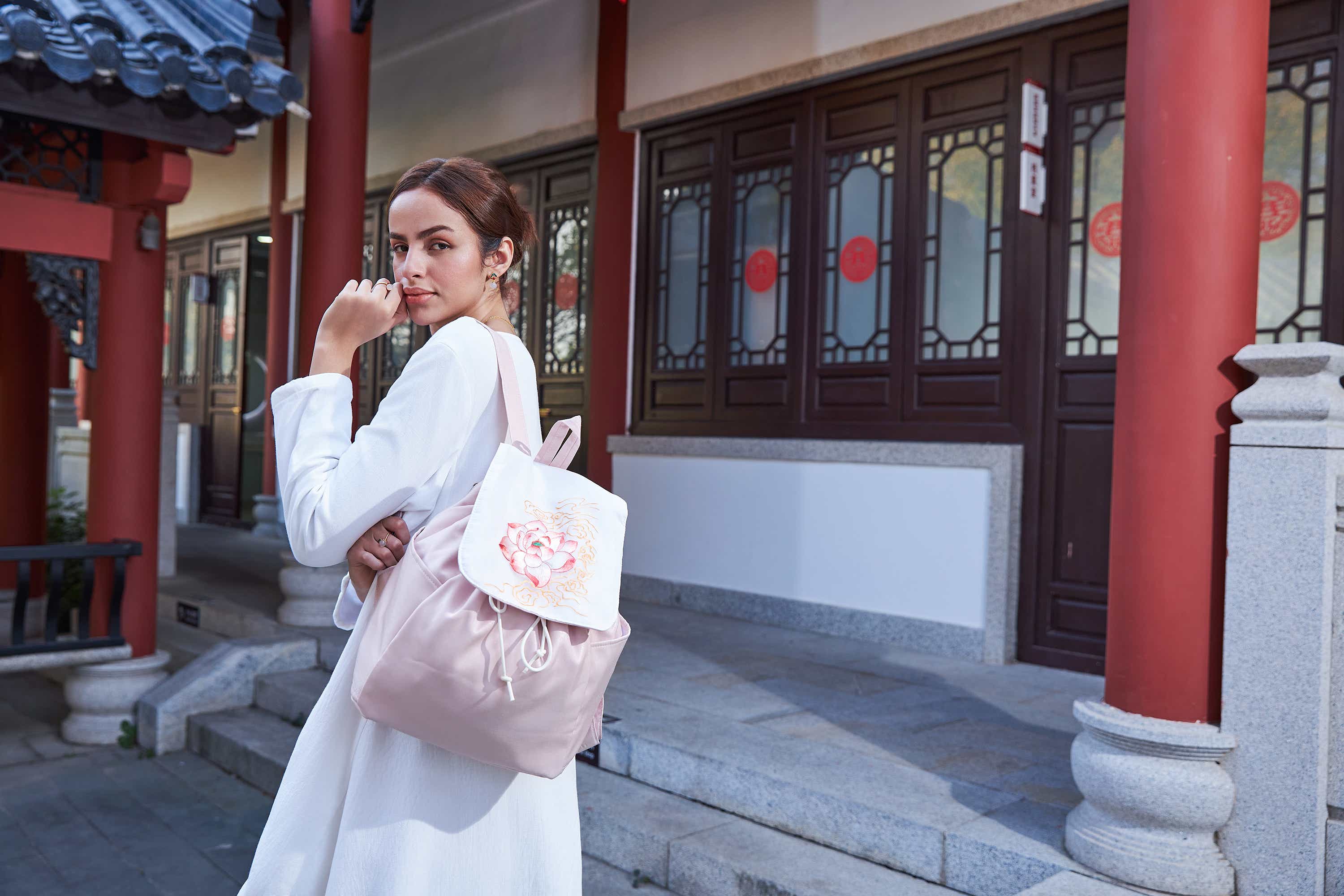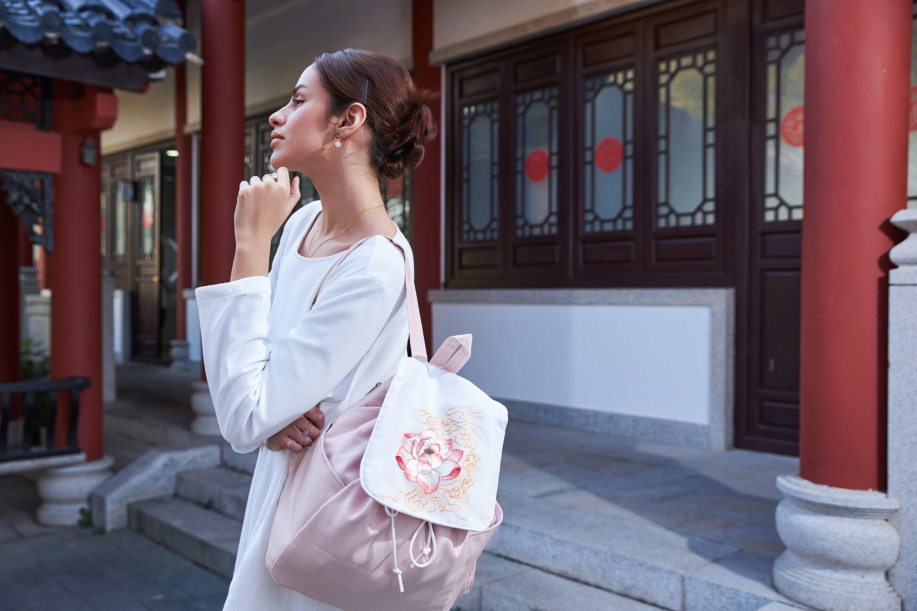 This elegant pink linen daypack showcases lavish Peony Su Xiu embroidery, symbolizing prosperity and honor. Lightweight, durable, and a noble cultural statement for daily carry.