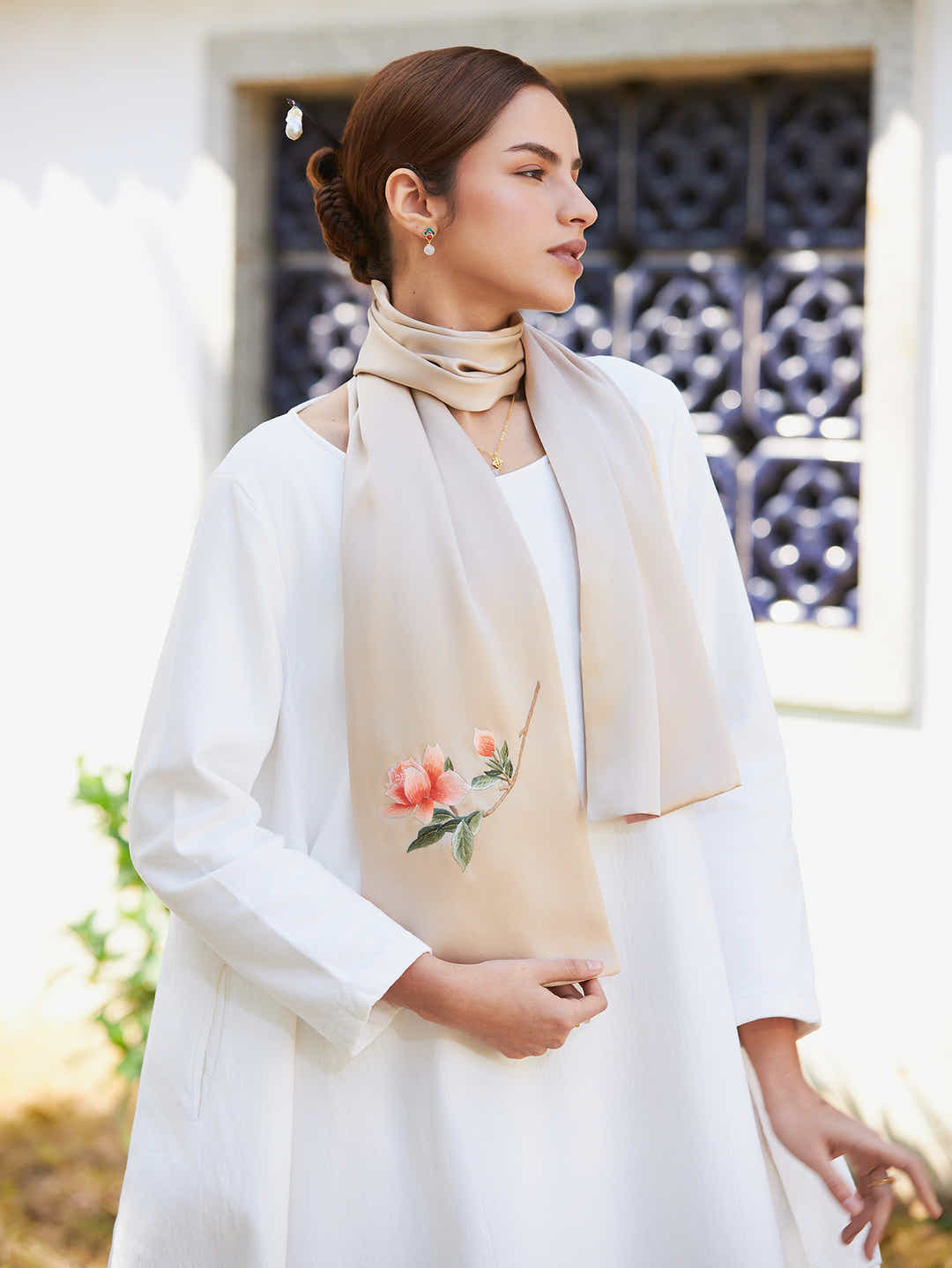 Champagne silk scarf with hand-embroidered gardenia motif. Crafted from 18 momme mulberry silk, elegant, breathable, and rich in heritage.