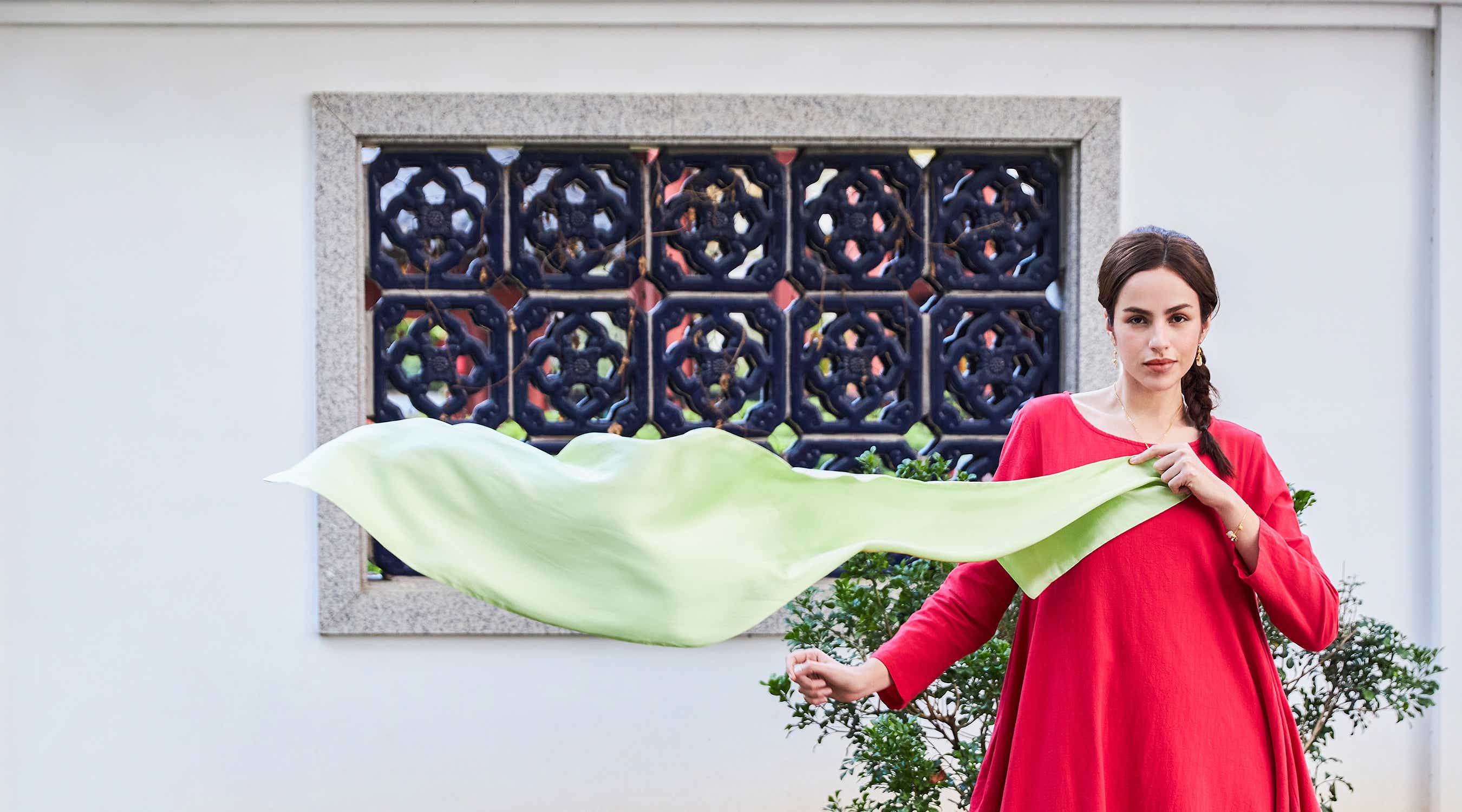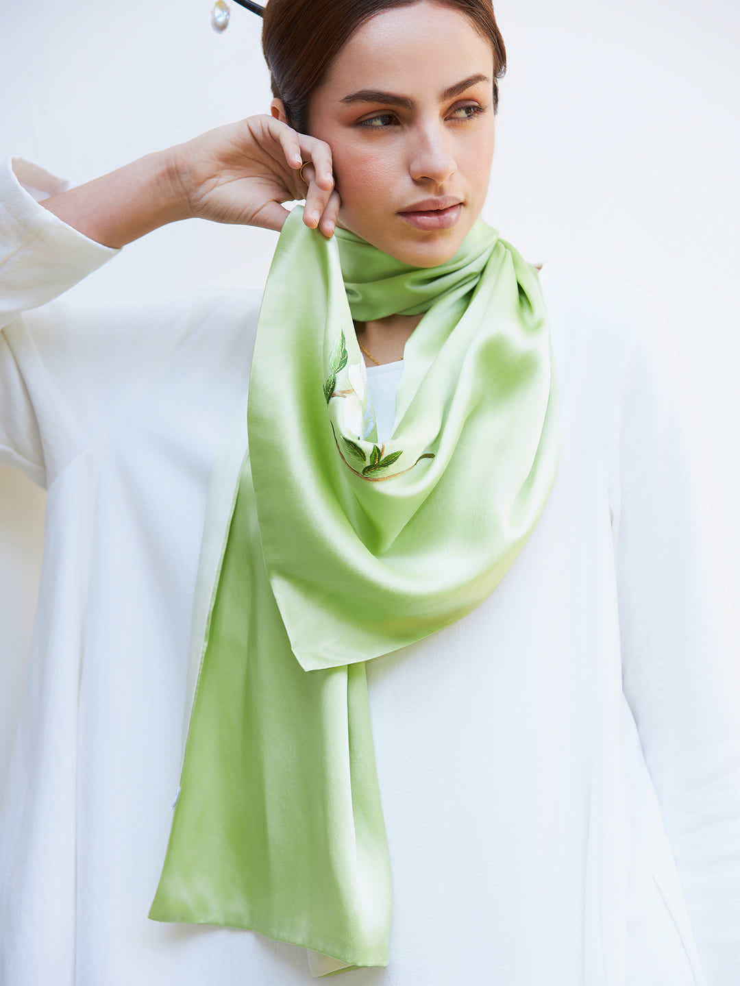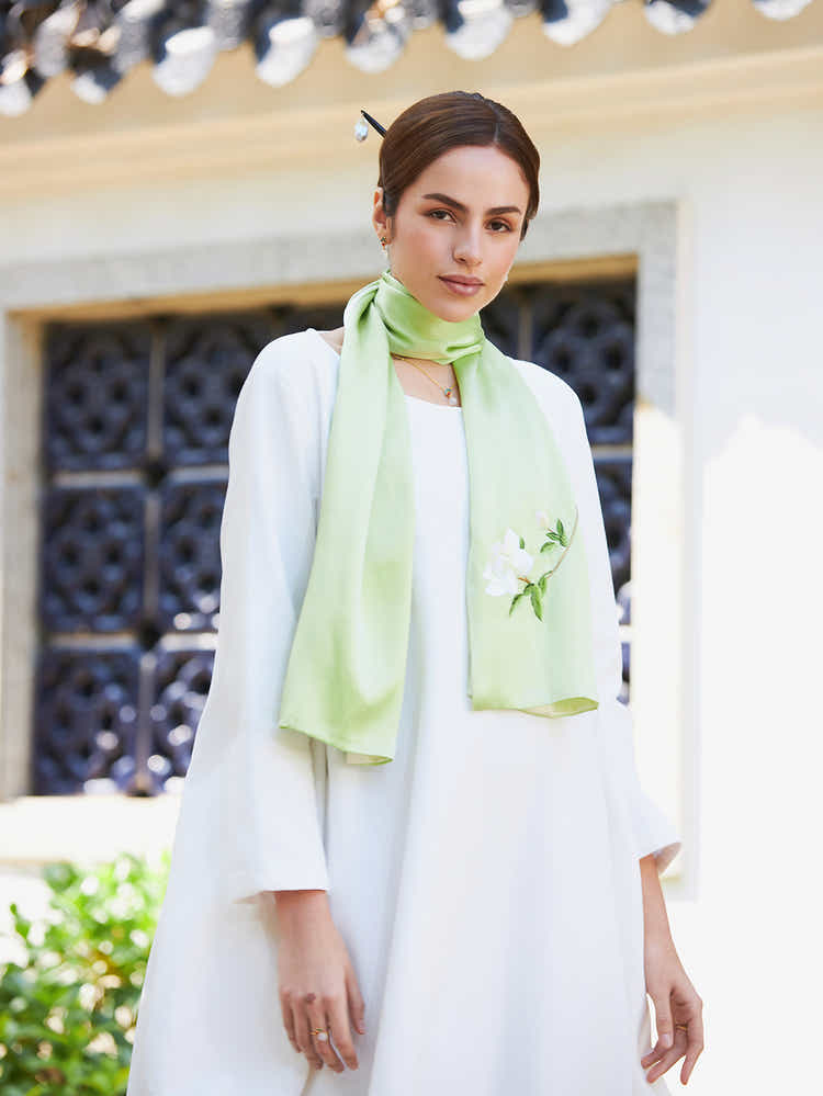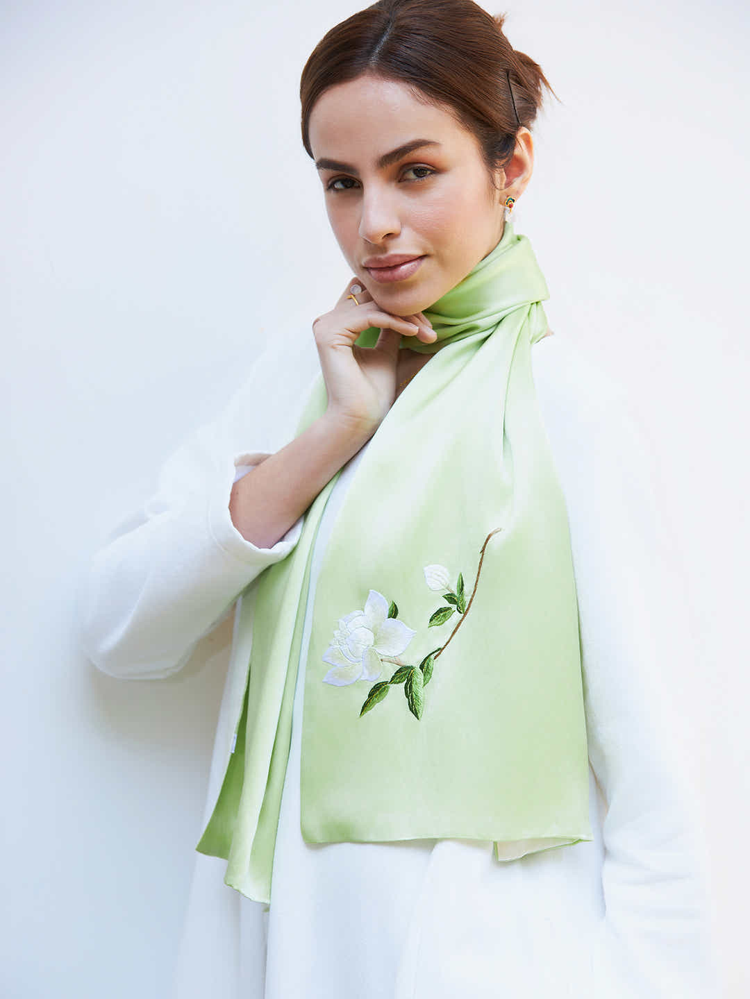 Eco-friendly green silk scarf with hand-embroidered gardenia motif. Crafted from 18 momme mulberry silk, elegant, breathable, and rich in heritage.