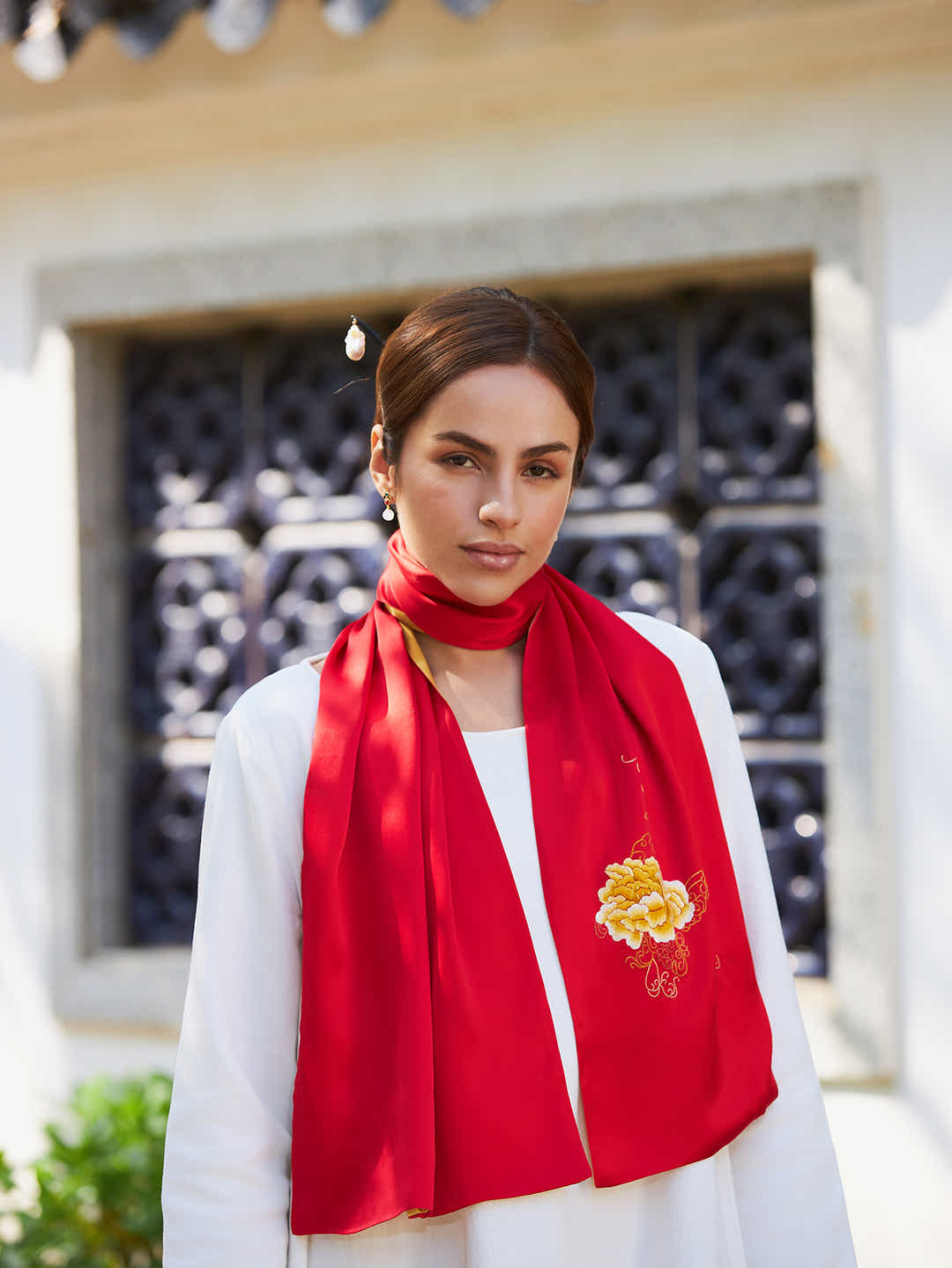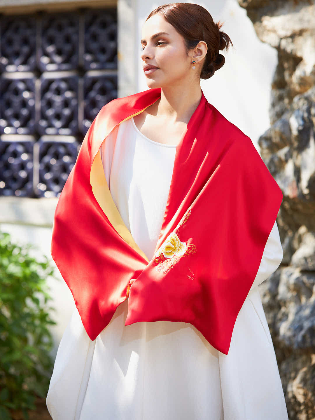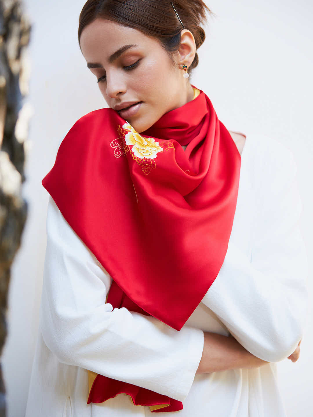 This handmade Su Xiu silk scarf features intricate gold peony embroidery on premium mulberry silk. A luxurious, versatile accessory combining comfort and culture.
