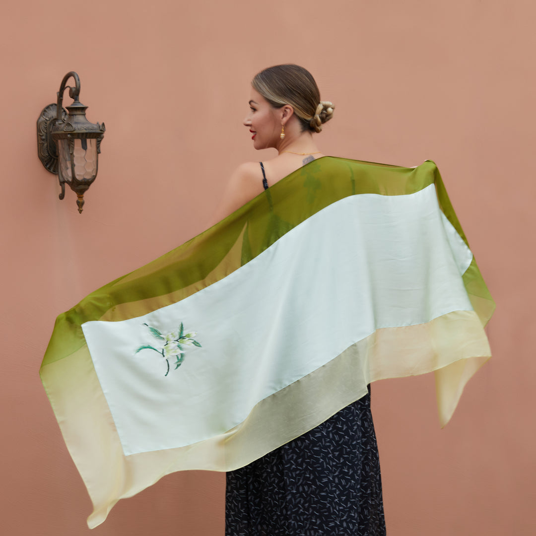 Genießen Sie die Schönheit jahrhundertealter Kunstfertigkeit mit unserem handbestickten Seidenschal. Jeder Stich spiegelt die akribische Kunstfertigkeit und Hingabe der Meisterhandwerker wider und schafft ein einzigartiges Unikat.