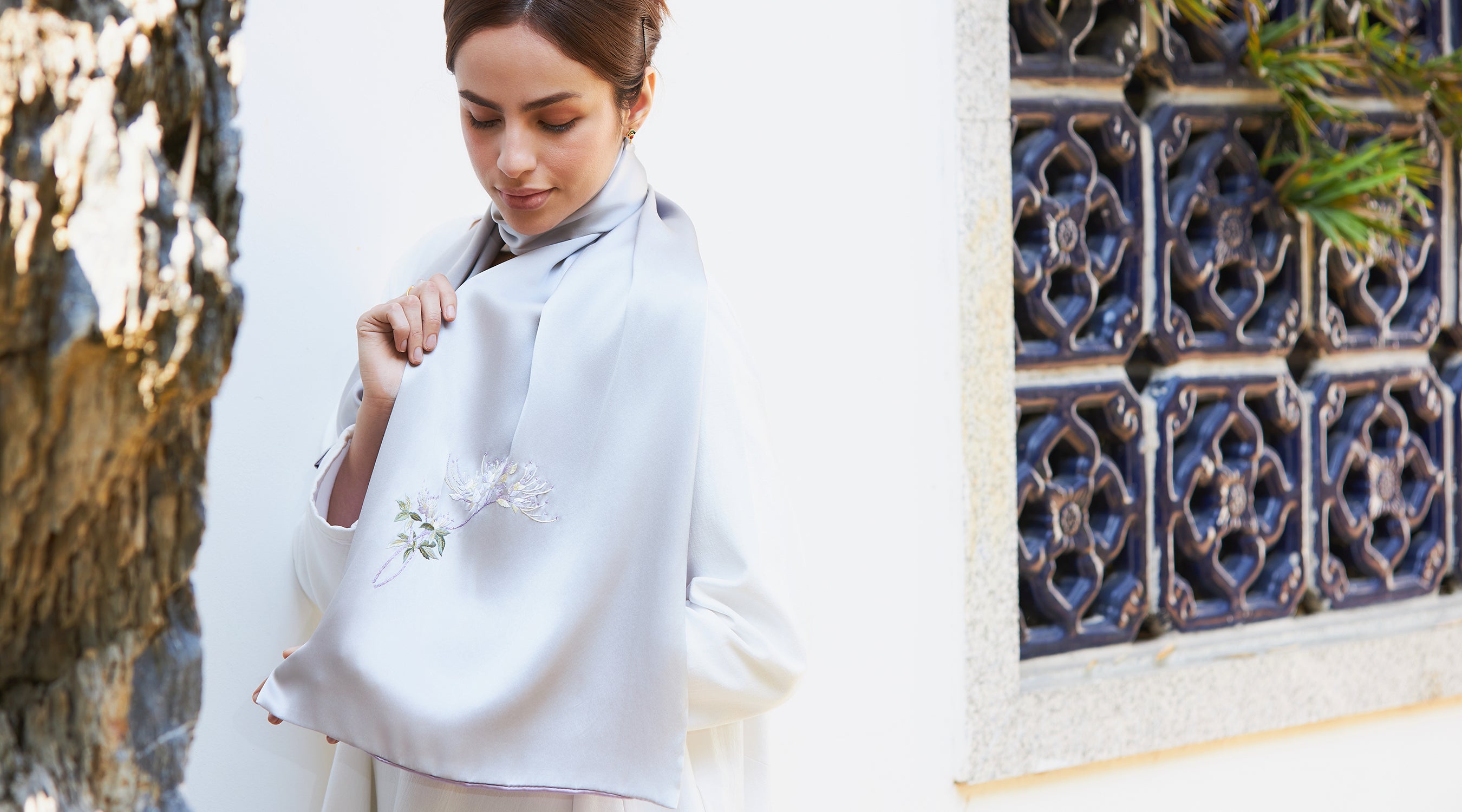Hand-Embroidered Su Xiu Mulberry Silk Scarf – Silver Grey Orchid