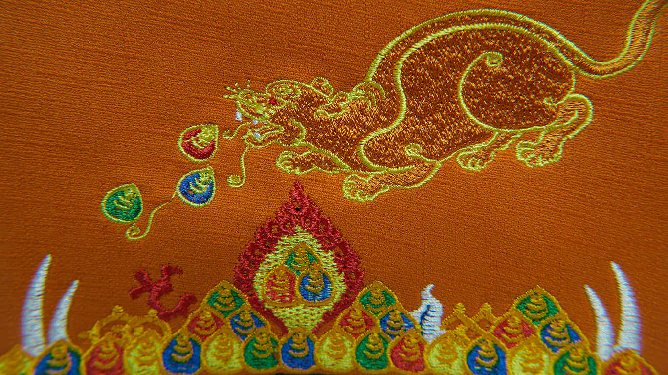 Carry vibrant energy and fortune. This lightweight orange linen tote features fine embroidery of the Jewel Mongoose, a Tibetan symbol of prosperity.