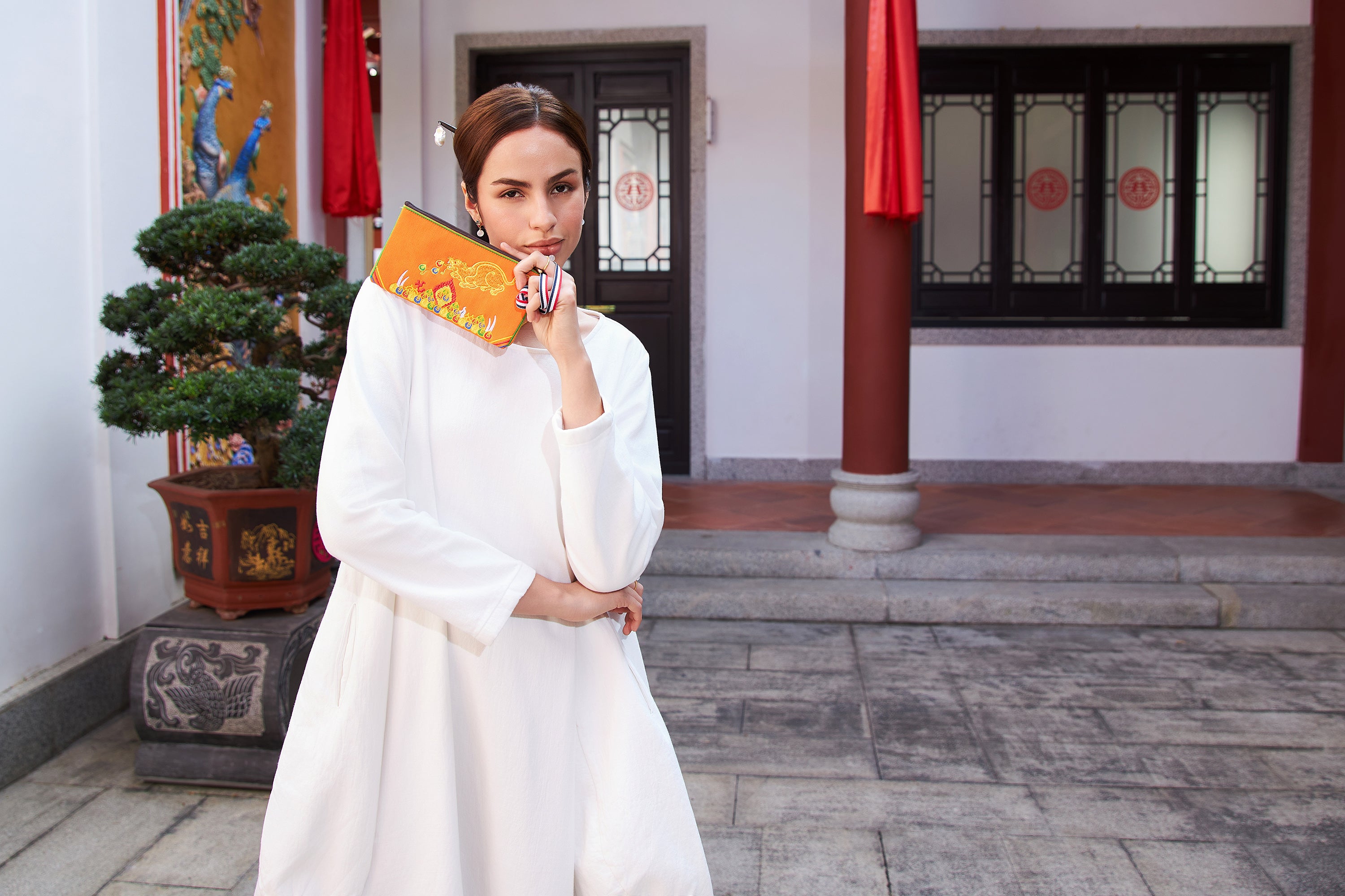 The vibrant orange hue reflects the warmth and spiritual light of the region, making a bold, cultured statement. Paired with the fine texture of linen, it exudes a sophisticated energy.