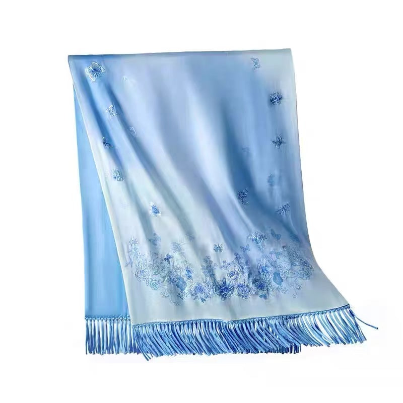 This exquisite scarf features Su Xiu embroidery, an ancient Chinese craft dating back over 2,500 years, recognized as part of China’s intangible cultural heritage. Hand-embroidered by master artisans in Suzhou, it captures the beauty and precision of traditional Chinese artistry.