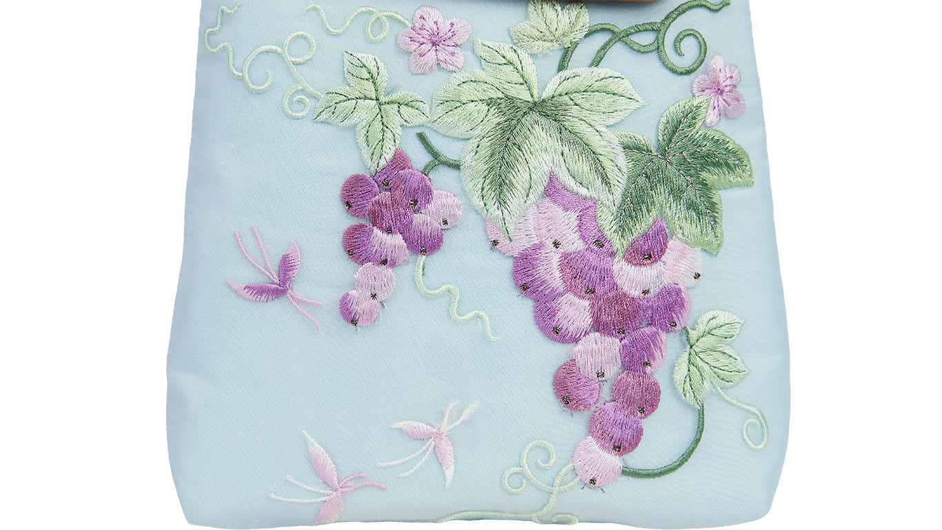The detailed grape pattern is rendered in high-quality embroidery, ensuring that the design is a vibrant, durable, and lasting statement of traditional artistry.