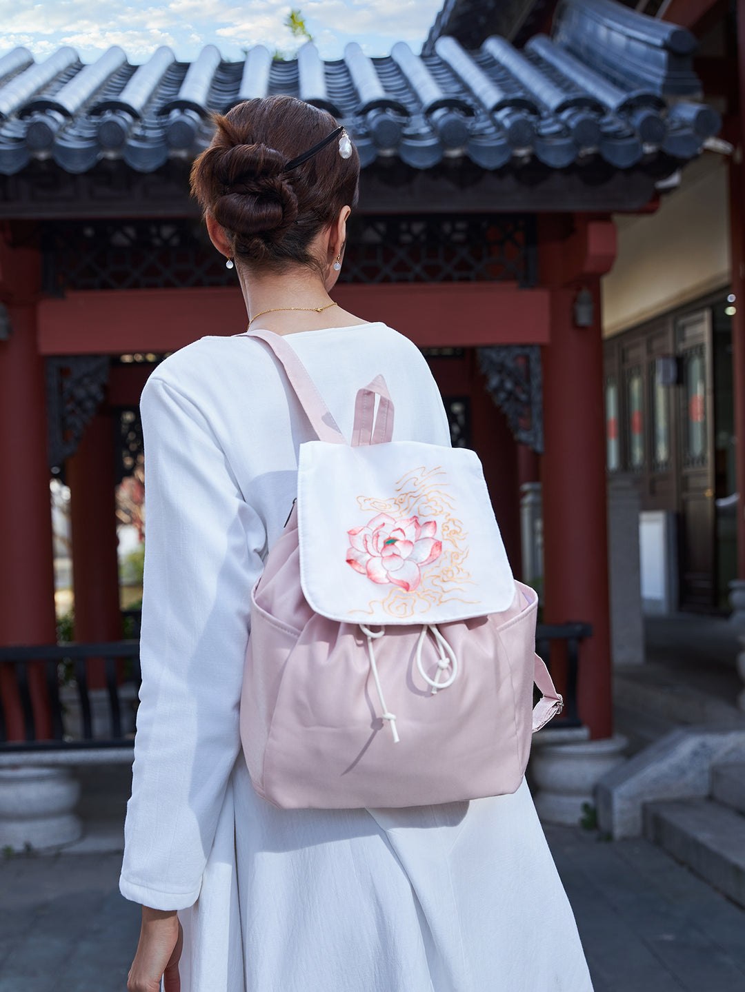 This elegant pink linen daypack showcases lavish Peony Su Xiu embroidery, symbolizing prosperity and honor. Lightweight, durable, and a noble cultural statement for daily carry.