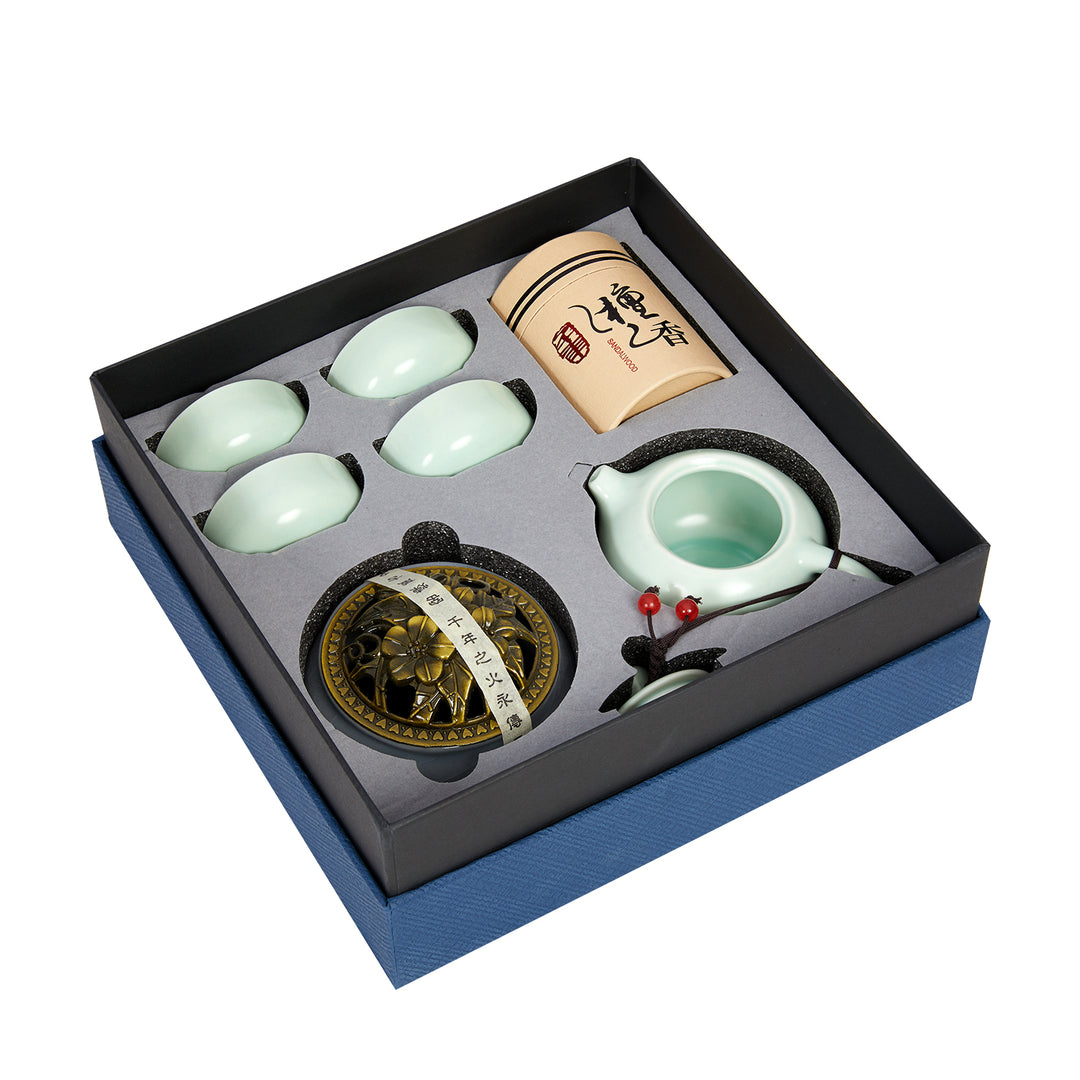 The tea set includesa teapot, cups, and an incense burner, all encased in a stylish and durable carry bag. Enjoy on-the-go tea sessions with a touch of aromatic luxury.