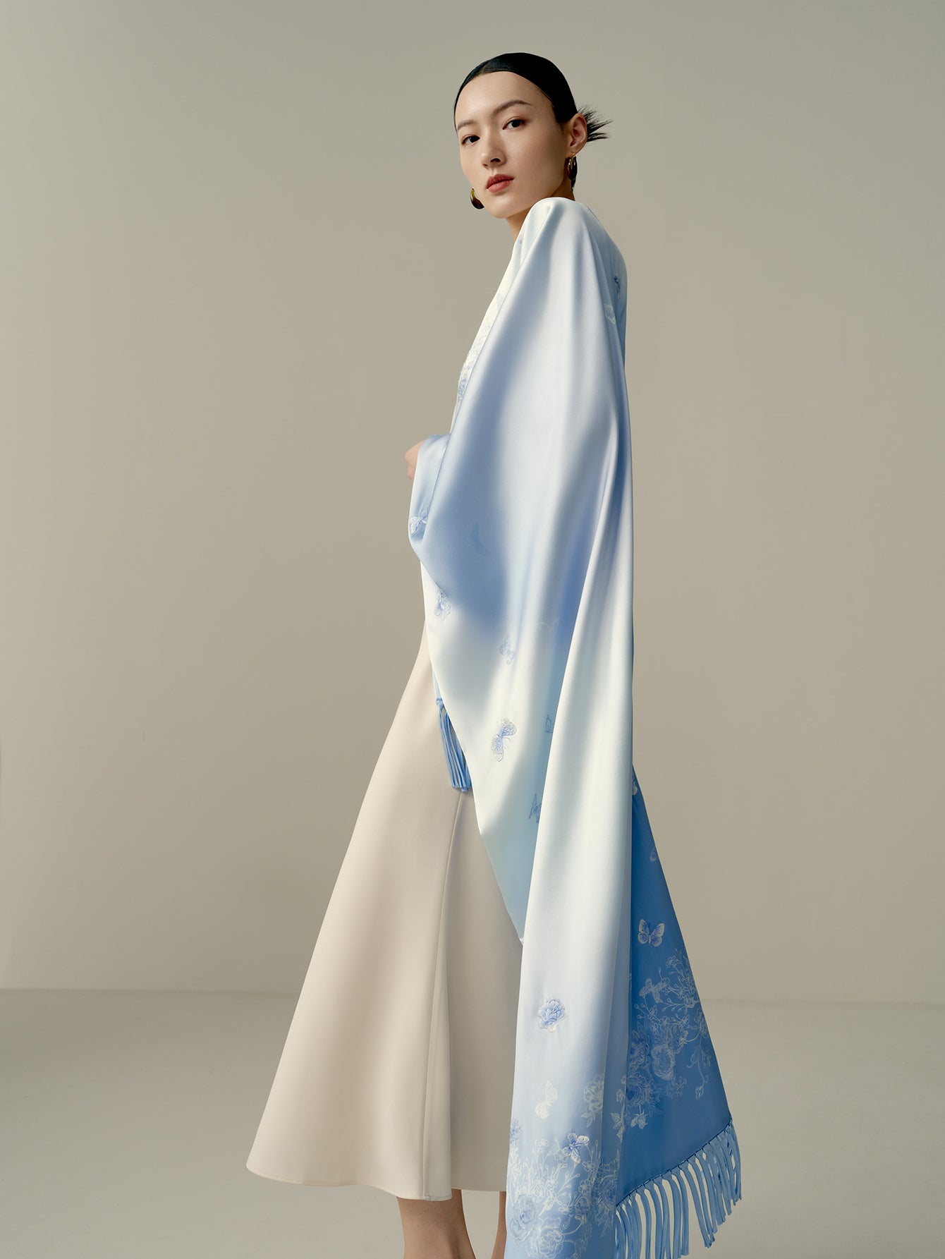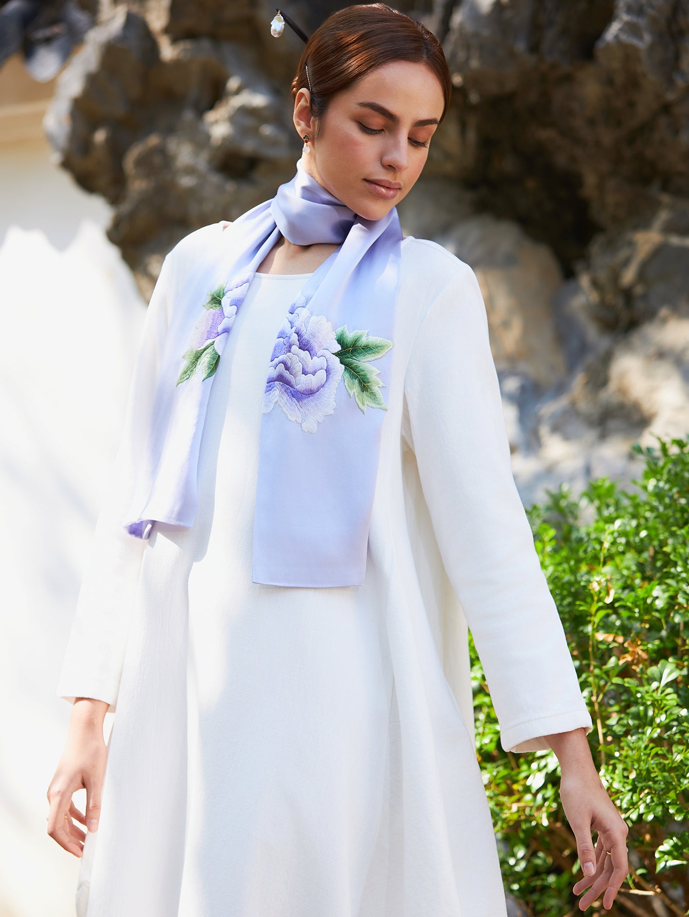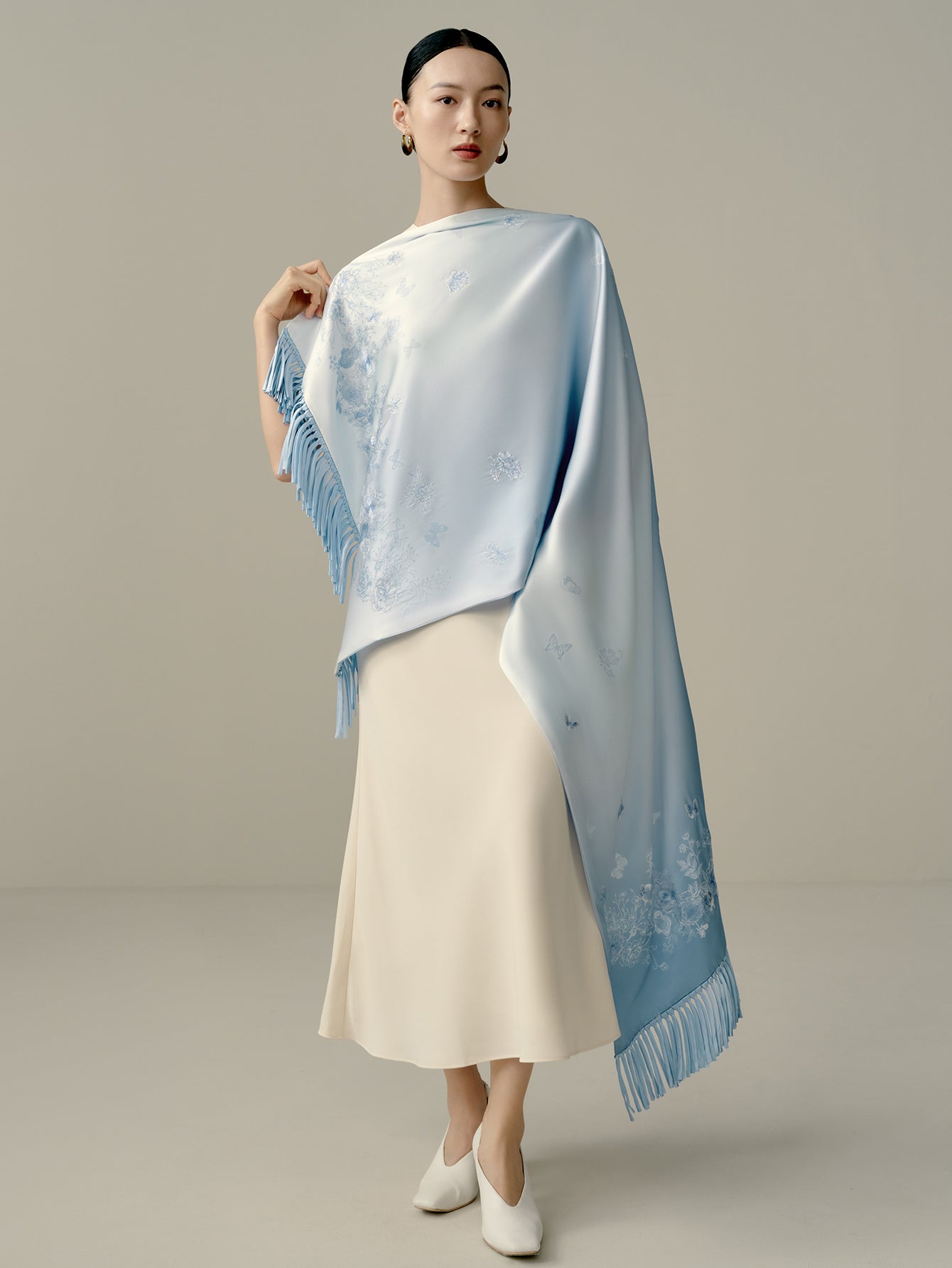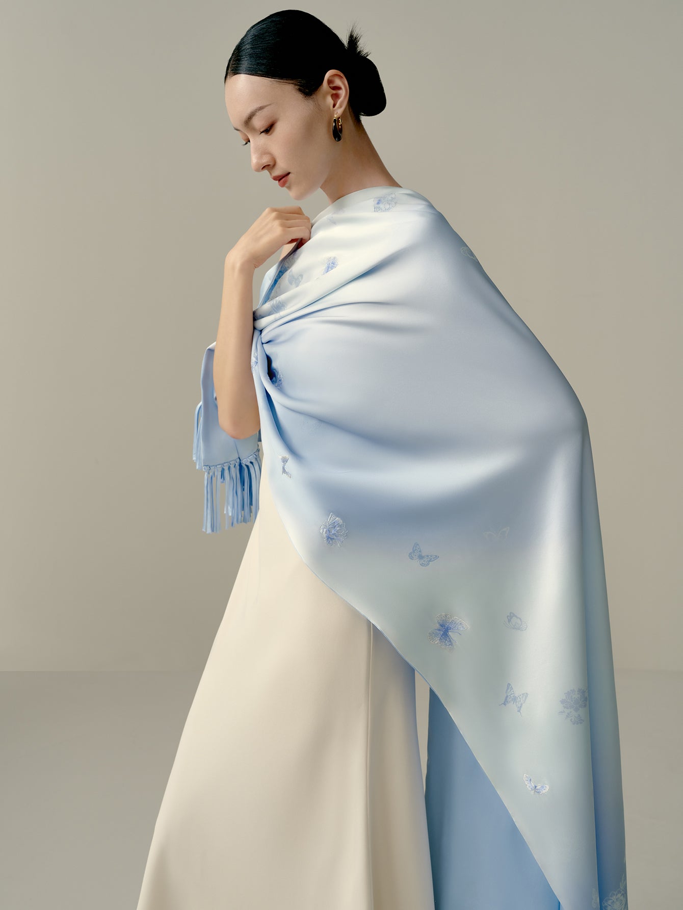 This exquisite scarf features Su Xiu embroidery, an ancient Chinese craft dating back over 2,500 years, recognized as part of China’s intangible cultural heritage. Hand-embroidered by master artisans in Suzhou, it captures the beauty and precision of traditional Chinese artistry.
