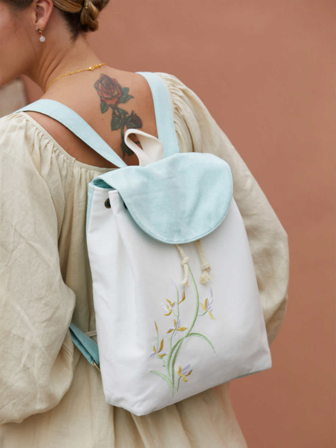- Dressed in pristine white eco-linen, this daypack features delicate Orchid Su Xiu embroidery and a vintage charm. It is light, durable, and a pure statement of Oriental elegance for daily use.